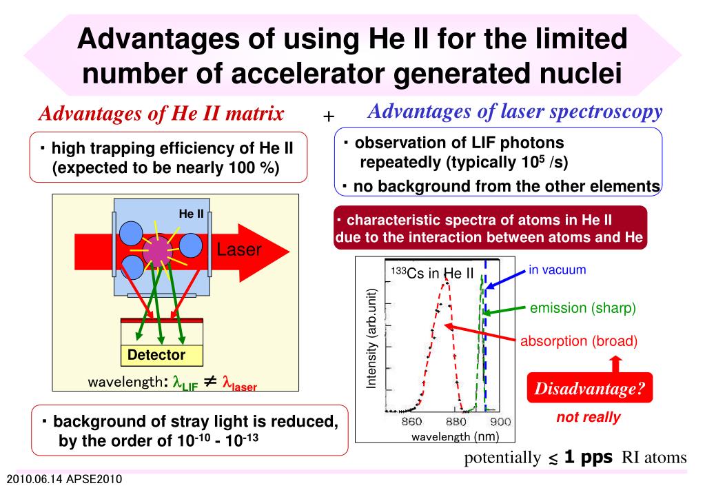 ・ observation of LIF photons repeatedly (typically 105 /s) ・ high trapping efficiency of He II (expected to be nearly 100 %) ・ no background from the other elements ・ characteristic spectra of atoms in He II due to the interaction between atoms and He He II Laser in vacuum 133Cs in He II emission (sharp) Intensity (arb.unit) absorption (broad) Detector Disadvantage? wavelength:lLIF≠llaser not really ・ background of stray light is reduced, by the order of 10-10 - 10-13 < ~ wavelength (nm) potentially 1 pps RI atoms Advantages of using He II for the limited number of accelerator generated nuclei Advantages of laser spectroscopy Advantages of He II matrix +