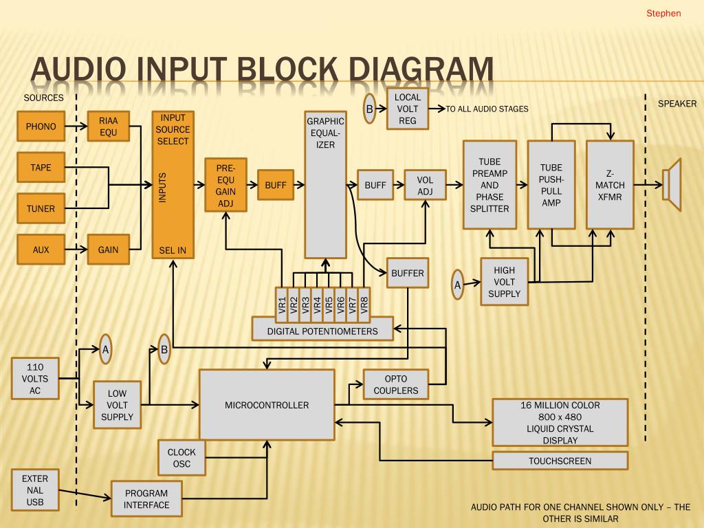 Stephen AUDIO INPUT BLOCK DIAGRAM SOURCES LOCAL VOLT REG B SPEAKER TO ALL AUDIO STAGES PHONO RIAA EQU INPUT SOURCESELECT GRAPHIC EQUAL-IZER TUBE PREAMP AND PHASE SPLITTER TUBE PUSH- PULL AMP Z- MATCH XFMR TAPE PRE-EQU GAIN ADJ BUFF BUFF VOL ADJ INPUTS TUNER AUX GAIN SEL IN BUFFER HIGH VOLT SUPPLY A VR1 VR2 VR3 VR4 DIGITAL POTENTIOMETERS VR5 A B VR6 VR7 110 VOLTS AC VR8 MICROCONTROLLER OPTO COUPLERS LOW VOLT SUPPLY 16 MILLION COLOR 800 x 480LIQUID CRYSTALDISPLAY CLOCK OSC TOUCHSCREEN EXTERNAL USB PROGRAM INTERFACE AUDIO PATH FOR ONE CHANNEL SHOWN ONLY – THE OTHER IS SIMILAR