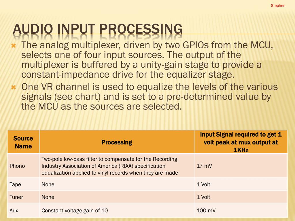 Stephen The analog multiplexer, driven by two GPIOs from the MCU, selects one of four input sources. The output of the multiplexer is buffered by a unity-gain stage to provide a constant-impedance drive for the equalizer stage. One VR channel is used to equalize the levels of the various signals (see chart) and is set to a pre-determined value by the MCU as the sources are selected. AUDIO INPUT PROCESSING