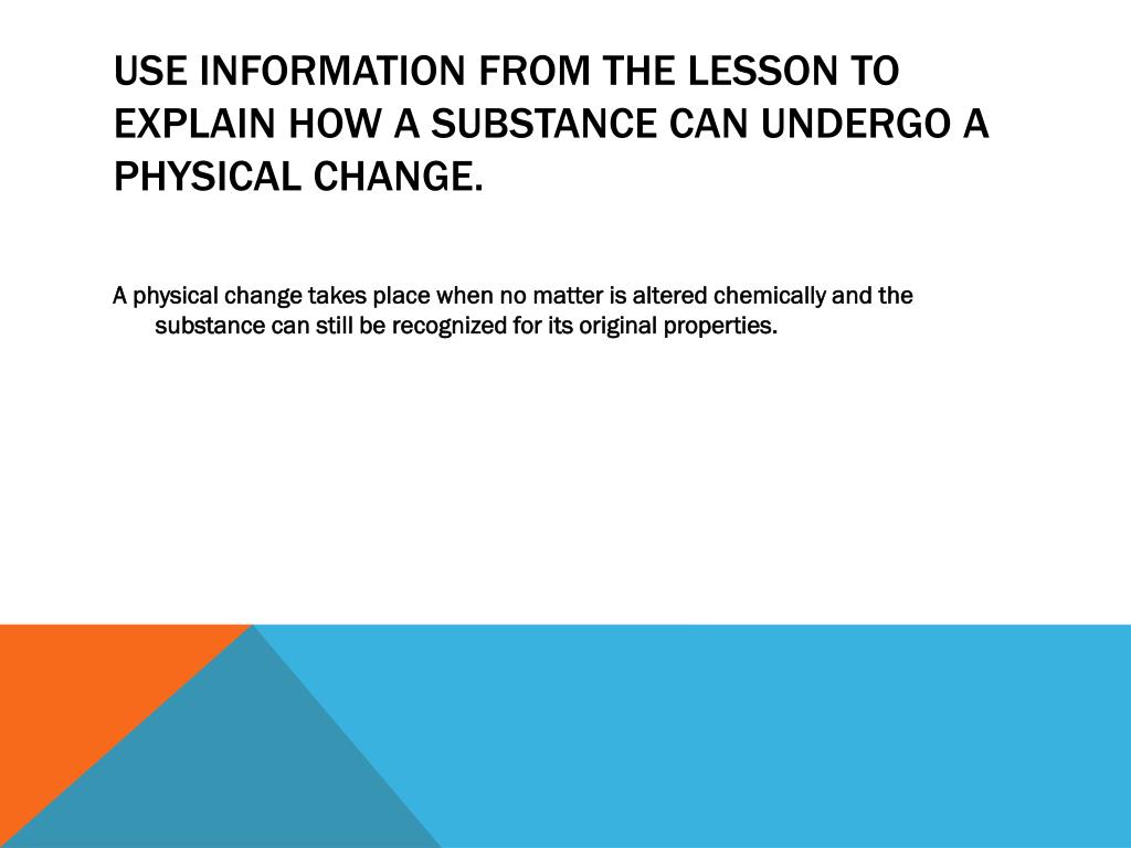 use information from the lesson to explain how a substance can undergo a physical change. • A physical change takes place when no matter is altered chemically and the substance can still be recognized for its original properties.