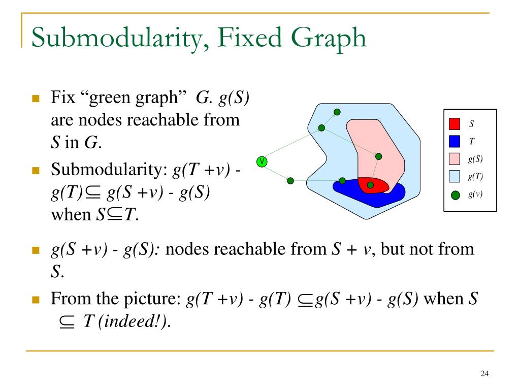 Submodularity, Fixed Graph • Fix “green graph” G. g(S) are nodes reachable from S in G. • Submodularity: g(T +v) - g(T) g(S +v) - g(S) when S T. • g(S +v) - g(S): nodes reachable from S + v, but not from S. • From the picture: g(T +v) - g(T) g(S +v) - g(S) when S T (indeed!).