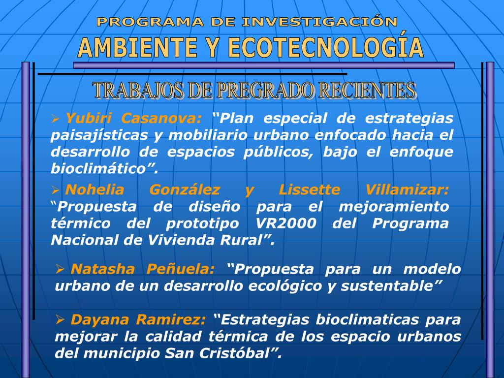 PROGRAMA DE INVESTIGACIÓN AMBIENTE Y ECOTECNOLOGÍA TRABAJOS DE PREGRADO RECIENTES • Yubiri Casanova: “Plan especial de estrategias paisajísticas y mobiliario urbano enfocado hacia el desarrollo de espacios públicos, bajo el enfoque bioclimático”. • Nohelia González y Lissette Villamizar: “Propuesta de diseño para el mejoramiento térmico del prototipo VR2000 del Programa Nacional de Vivienda Rural”. • Natasha Peñuela: “Propuesta para un modelo urbano de un desarrollo ecológico y sustentable” • Dayana Ramirez: “Estrategias bioclimaticas para mejorar la calidad térmica de los espacio urbanos del municipio San Cristóbal”.
