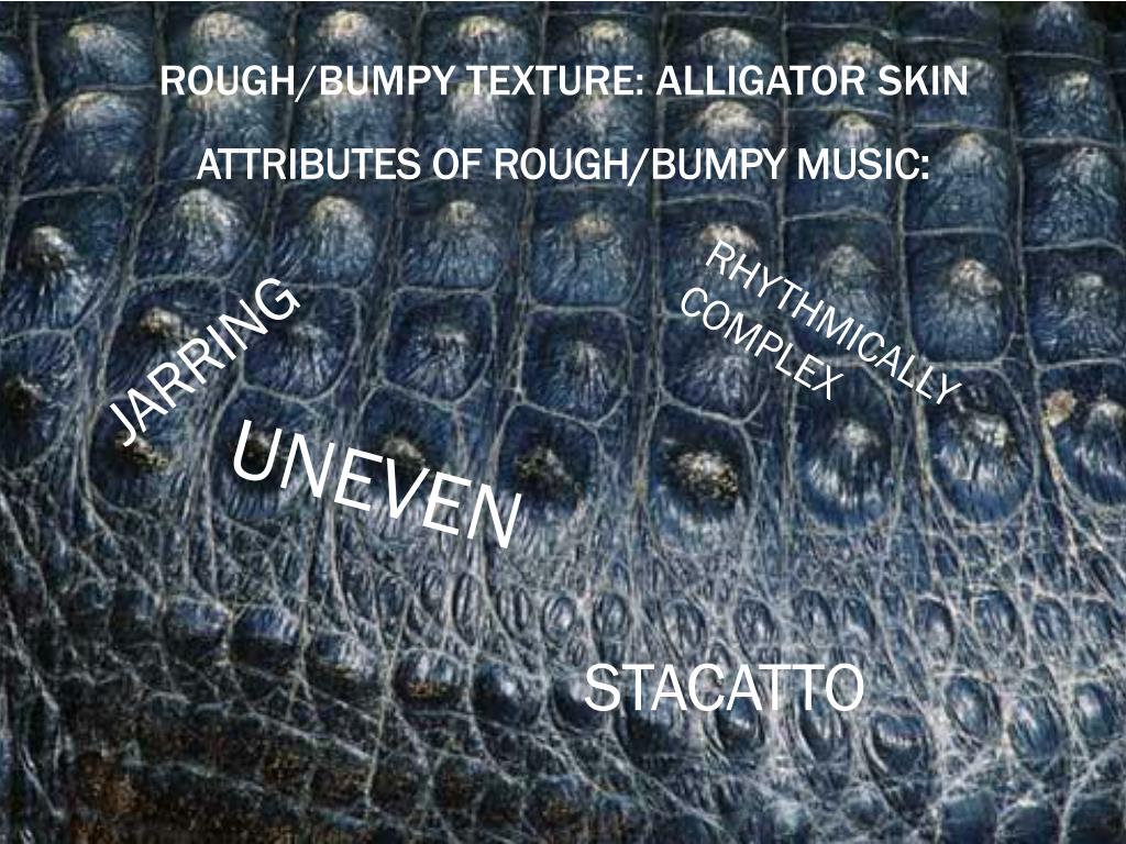 Rough/Bumpy texture: Alligator skin • ATTRIBUTES OF ROUGH/BUMPY MUSIC: JARRING RHYTHMICALLY COMPLEX UNEVEN STACATTO