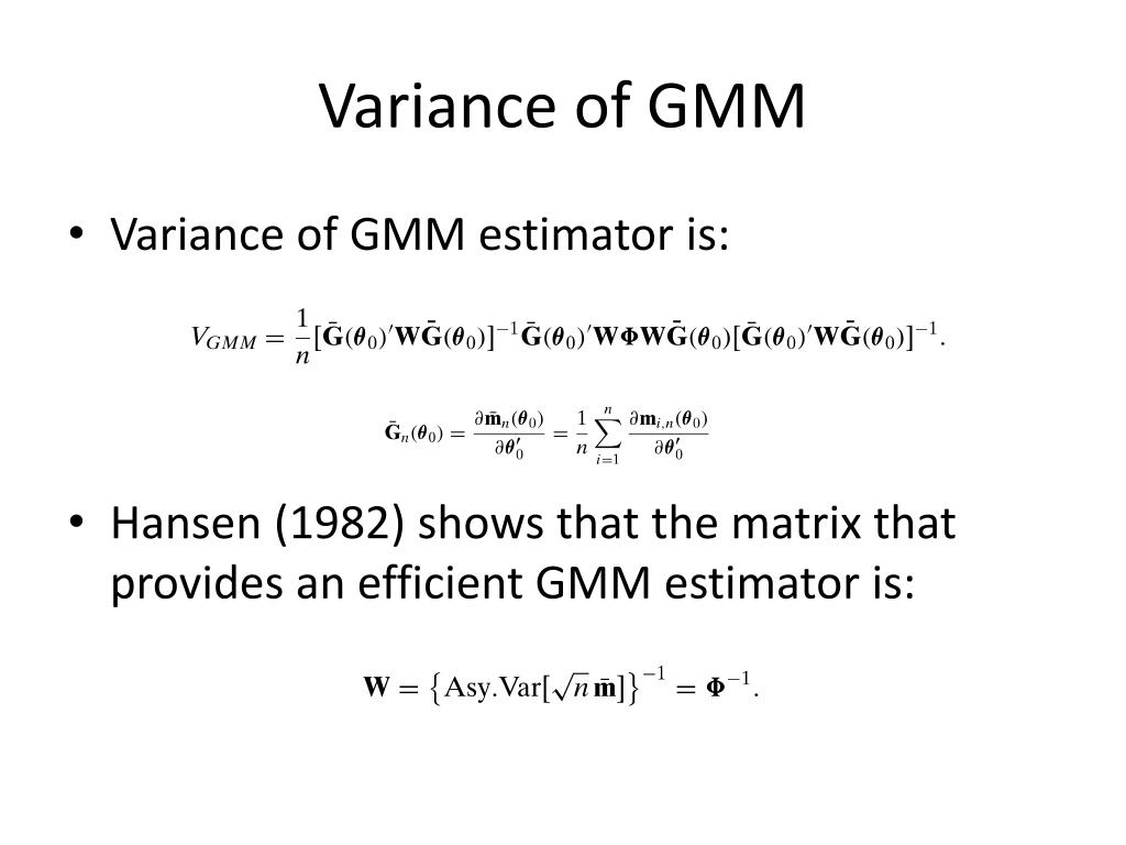 Variance of GMM • Variance of GMM estimator is: • Hansen (1982) shows that the matrix that provides an efficient GMM estimator is: