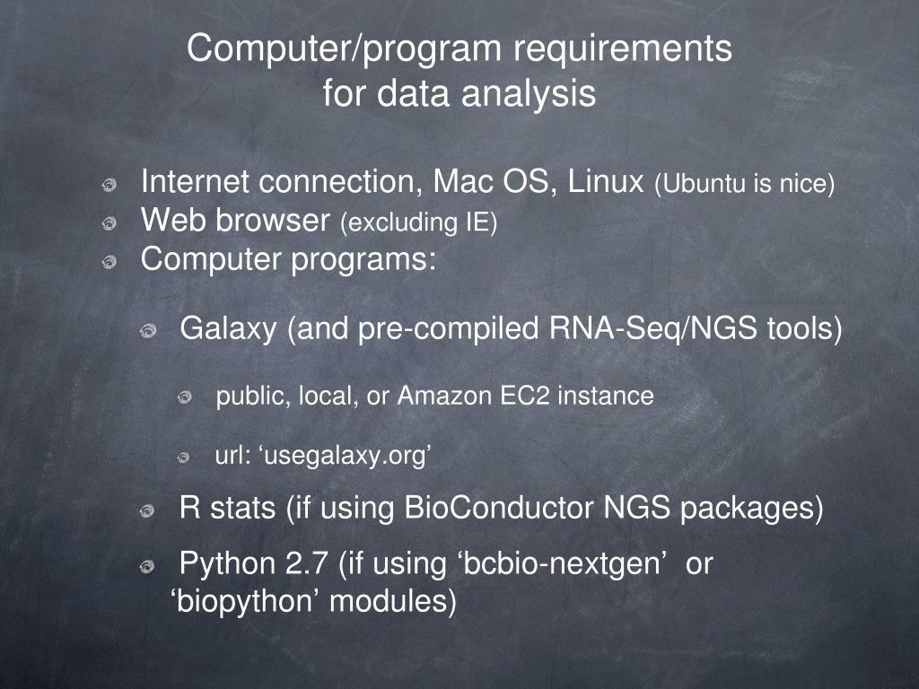 Computer/program requirements for data analysis • Internet connection, Mac OS, Linux (Ubuntu is nice) • Web browser (excluding IE) • Computer programs: • Galaxy (and pre-compiled RNA-Seq/NGS tools) • public, local, or Amazon EC2 instance • url: ‘usegalaxy.org’ • R stats (if using BioConductor NGS packages) • Python 2.7 (if using ‘bcbio-nextgen’ or ‘biopython’ modules)