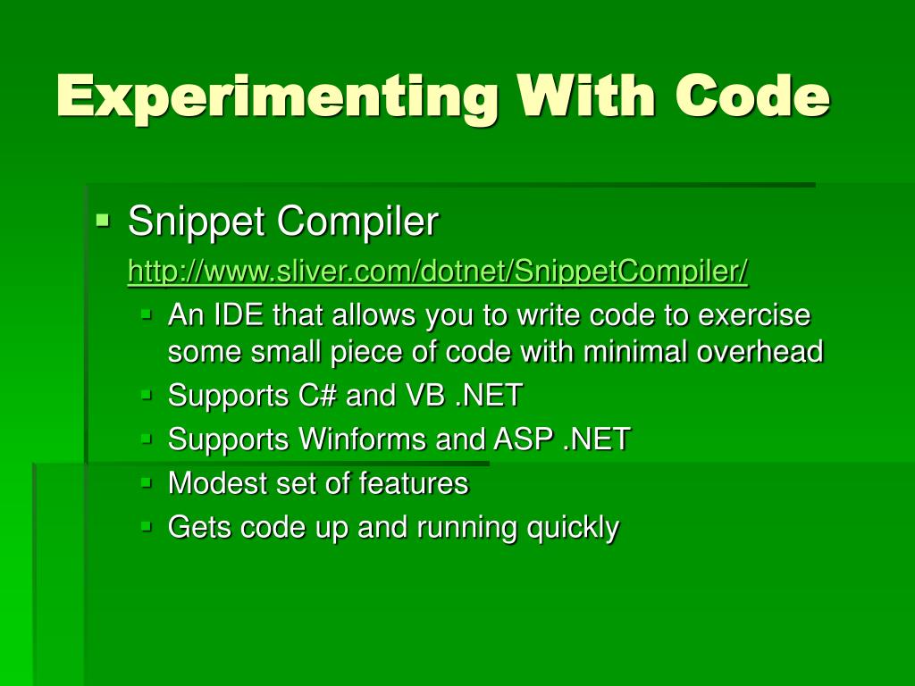 Experimenting With Code • Snippet Compiler http://www.sliver.com/dotnet/SnippetCompiler/ • An IDE that allows you to write code to exercise some small piece of code with minimal overhead • Supports C# and VB .NET • Supports Winforms and ASP .NET • Modest set of features • Gets code up and running quickly