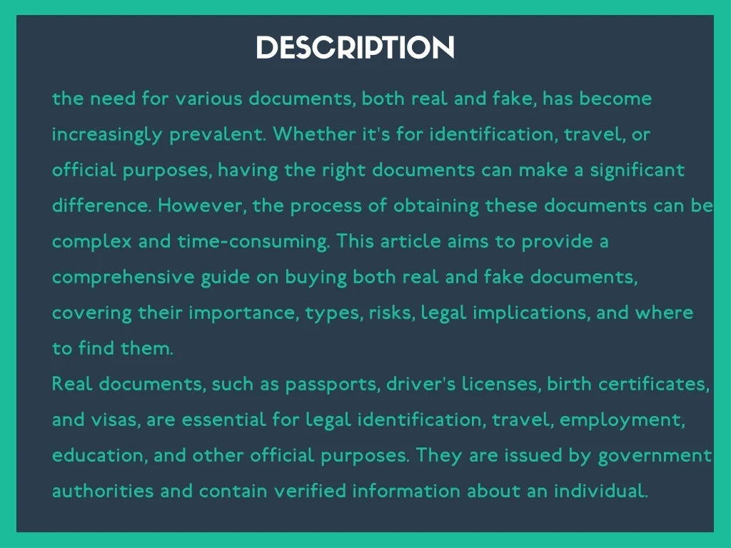 DESCRIPTION the need for various documents, both real and fake, has become increasingly prevalent. Whether it's for identification, travel, or official purposes, having the right documents can make a significant difference. However, the process of obtaining these documents can be complex and time-consuming. This article aims to provide a comprehensive guide on buying both real and fake documents, covering their importance, types, risks, legal implications, and where to find them. Real documents, such as passports, driver's licenses, birth certificates, and visas, are essential for legal identification, travel, employment, education, and other official purposes. They are issued by government authorities and contain verified information about an individual.