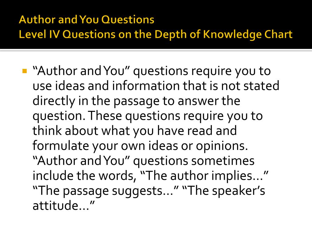 Author and You QuestionsLevel IV Questions on the Depth of Knowledge Chart • “Author and You” questions require you to use ideas and information that is not stated directly in the passage to answer the question. These questions require you to think about what you have read and formulate your own ideas or opinions. “Author and You” questions sometimes include the words, “The author implies…” “The passage suggests…” “The speaker’s attitude…”