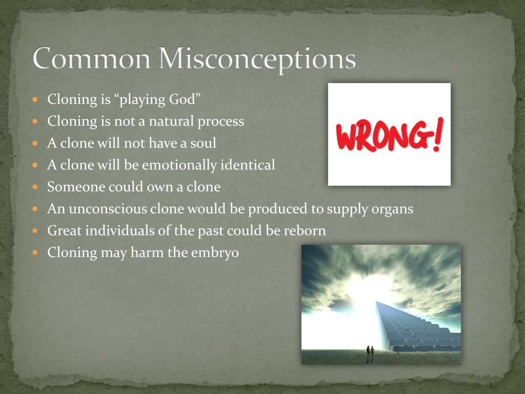 Common Misconceptions • Cloning is “playing God” • Cloning is not a natural process • A clone will not have a soul • A clone will be emotionally identical • Someone could own a clone • An unconscious clone would be produced to supply organs • Great individuals of the past could be reborn • Cloning may harm the embryo