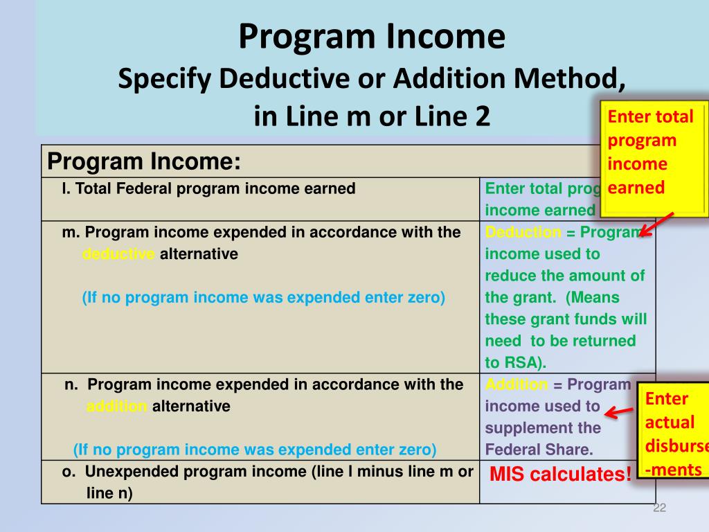 Program Income Specify Deductive or Addition Method, in Line m or Line 2 Enter total program income earned Enter actual disburse-ments
