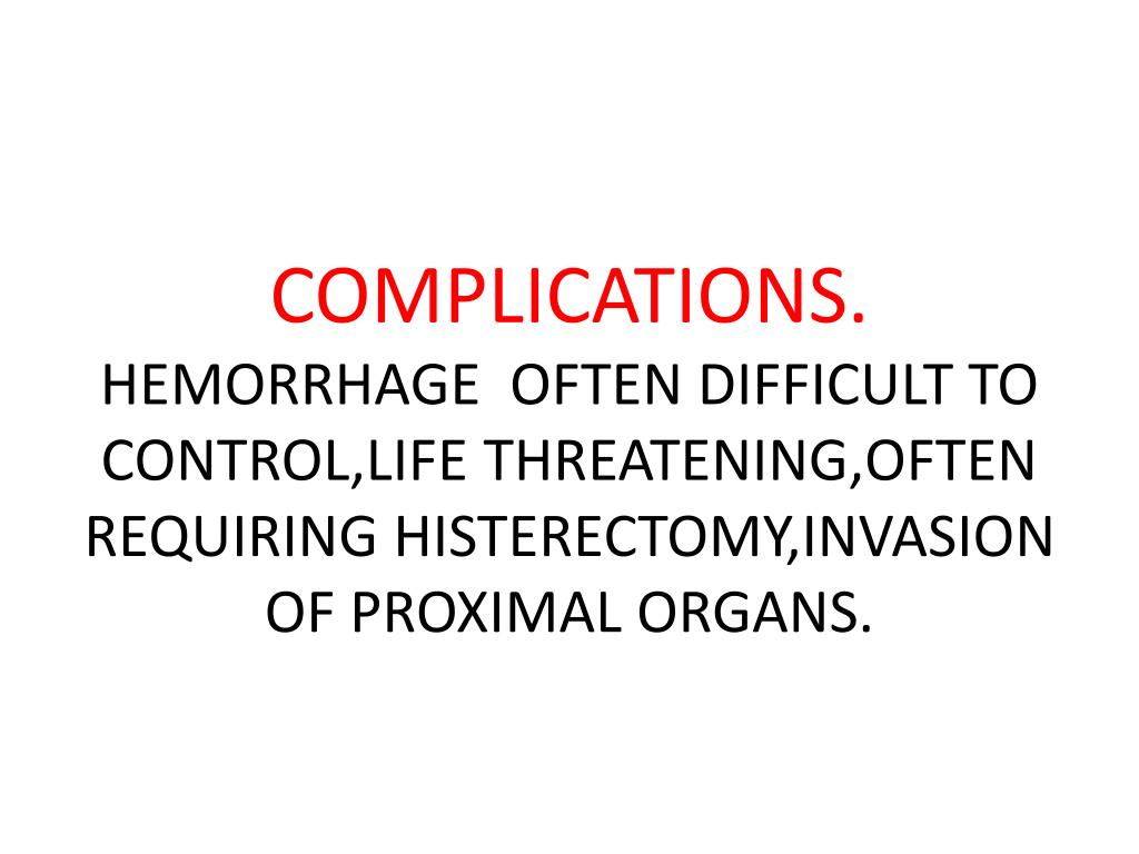 COMPLICATIONS.HEMORRHAGE OFTEN DIFFICULT TO CONTROL,LIFE THREATENING,OFTEN REQUIRING HISTERECTOMY,INVASION OF PROXIMAL ORGANS.
