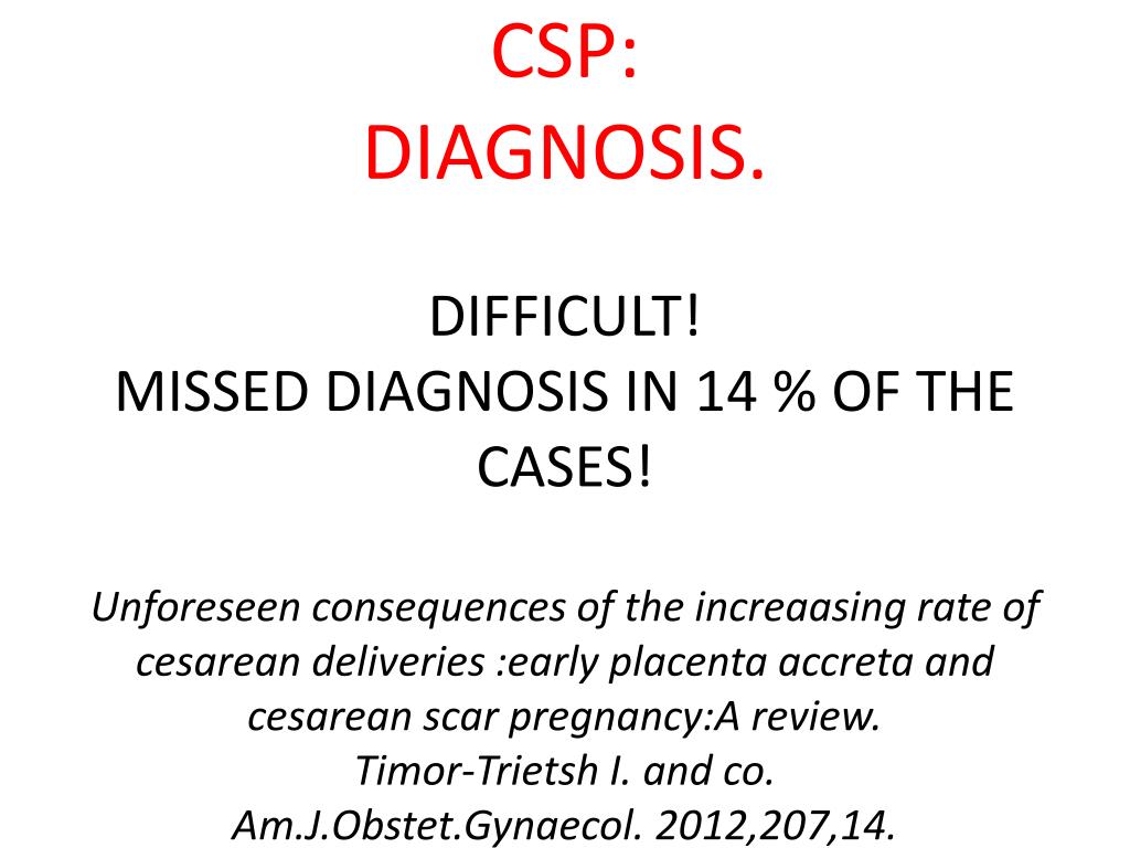 CSP:DIAGNOSIS.DIFFICULT!MISSED DIAGNOSIS IN 14 % OF THE CASES!Unforeseenconsequences of the increaasing rate of cesareandeliveries :early placenta accreta and cesareanscarpregnancy:A review.Timor-Trietsh I. and co.Am.J.Obstet.Gynaecol. 2012,207,14.