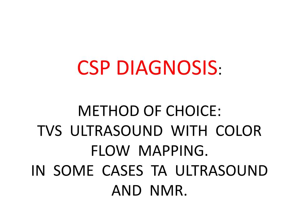 CSP DIAGNOSIS:METHOD OF CHOICE:TVS ULTRASOUND WITH COLOR FLOW MAPPING.IN SOME CASES TA ULTRASOUND AND NMR.