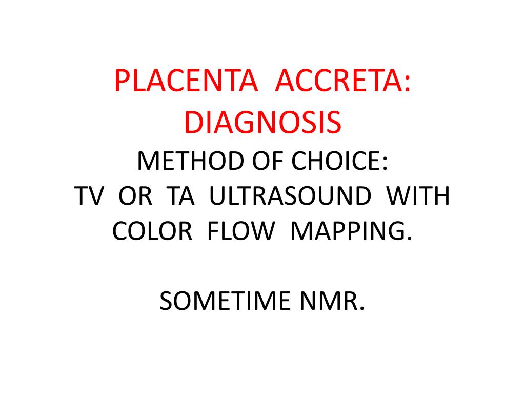 PLACENTA ACCRETA: DIAGNOSISMETHOD OF CHOICE:TV OR TA ULTRASOUND WITH COLOR FLOW MAPPING.SOMETIME NMR.