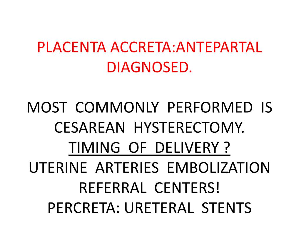 PLACENTA ACCRETA:ANTEPARTAL DIAGNOSED.MOST COMMONLY PERFORMED IS CESAREAN HYSTERECTOMY.TIMING OF DELIVERY ?UTERINE ARTERIES EMBOLIZATIONREFERRAL CENTERS!PERCRETA: URETERAL STENTS