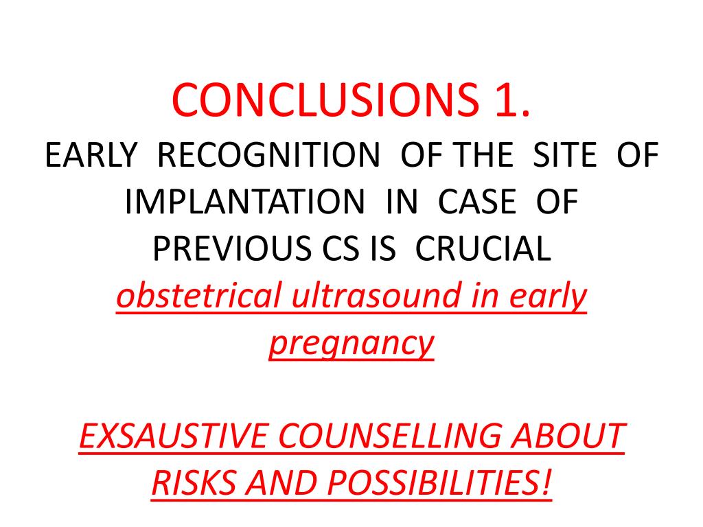 CONCLUSIONS 1.EARLY RECOGNITION OF THE SITE OF IMPLANTATION IN CASE OF PREVIOUS CS IS CRUCIALobstetrical ultrasound in earlypregnancyEXSAUSTIVE COUNSELLING ABOUT RISKS AND POSSIBILITIES!