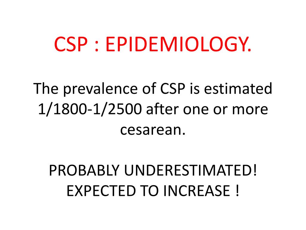 CSP : EPIDEMIOLOGY.The prevalence of CSP isestimated1/1800-1/2500 afterone or more cesarean.PROBABLY UNDERESTIMATED!EXPECTED TO INCREASE !