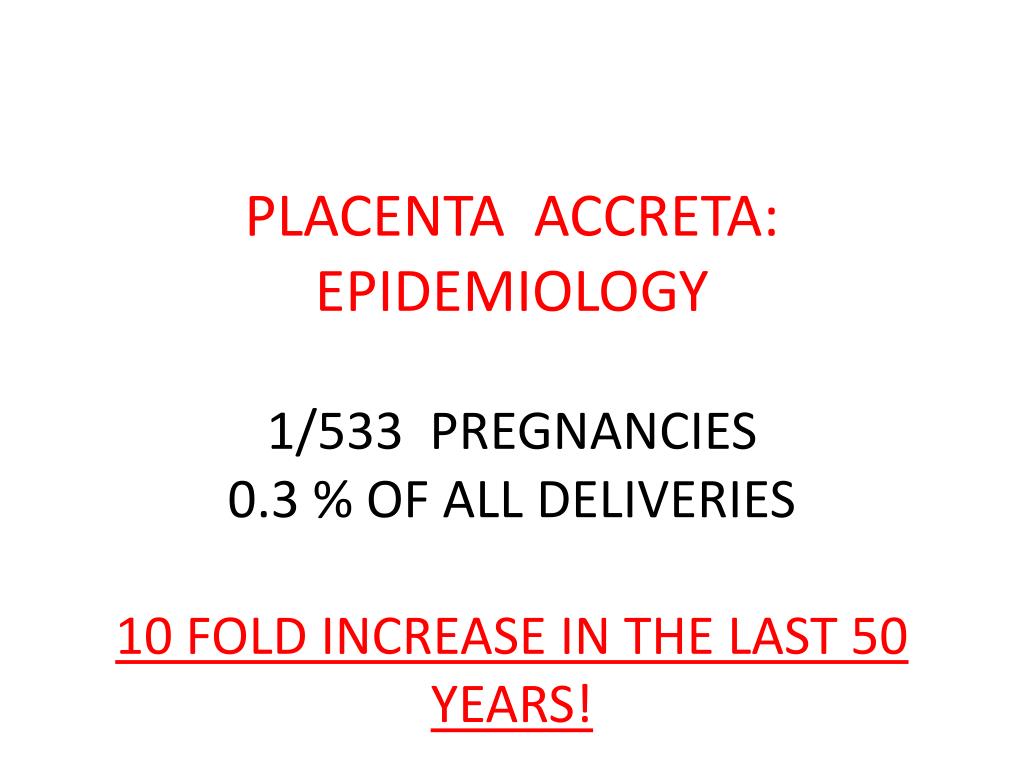 PLACENTA ACCRETA: EPIDEMIOLOGY1/533 PREGNANCIES0.3 % OF ALL DELIVERIES10 FOLD INCREASE IN THE LAST 50 YEARS!
