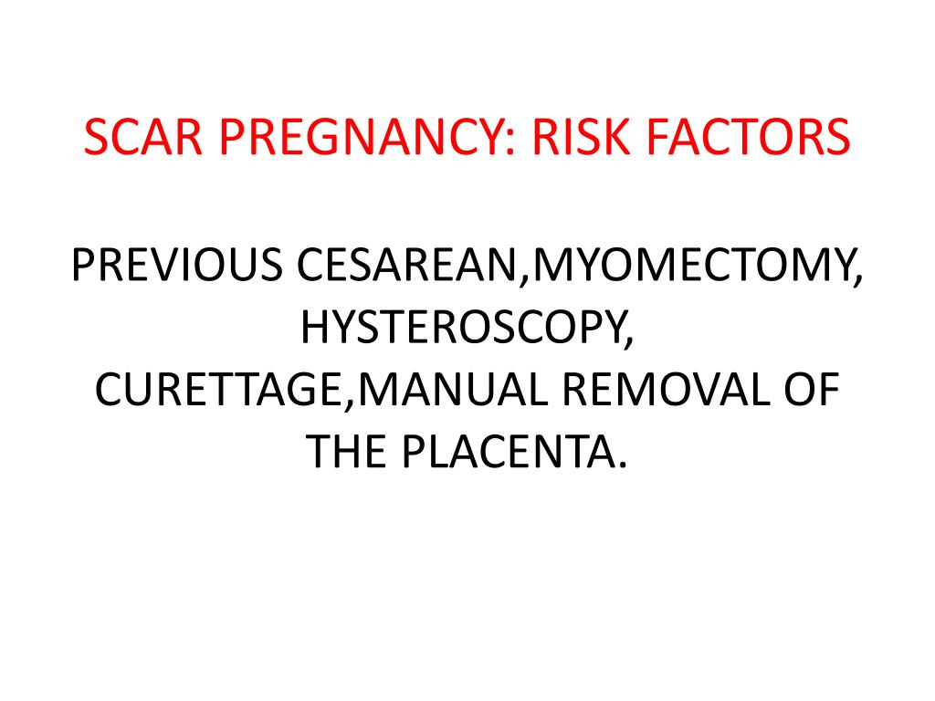 SCAR PREGNANCY: RISK FACTORSPREVIOUS CESAREAN,MYOMECTOMY,HYSTEROSCOPY,CURETTAGE,MANUAL REMOVAL OF THE PLACENTA.