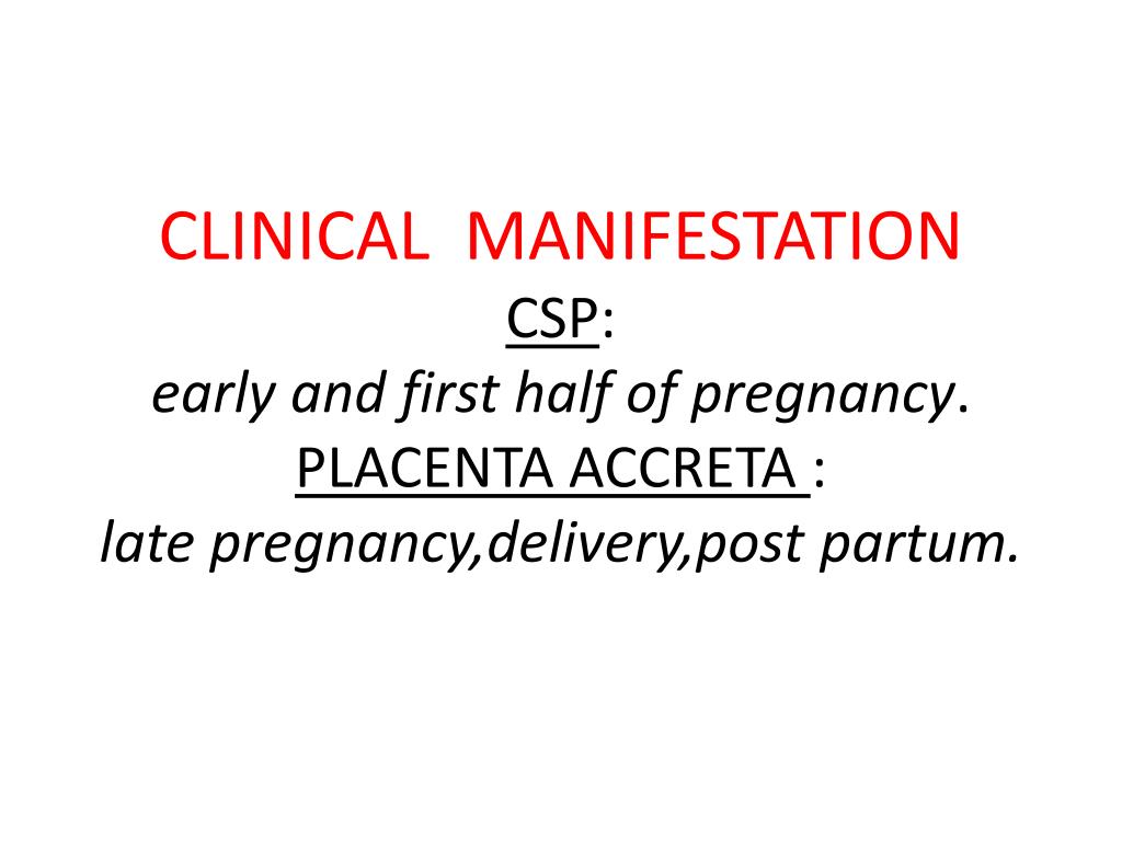 CLINICAL MANIFESTATIONCSP:early and first half of pregnancy.PLACENTA ACCRETA :latepregnancy,delivery,post partum.
