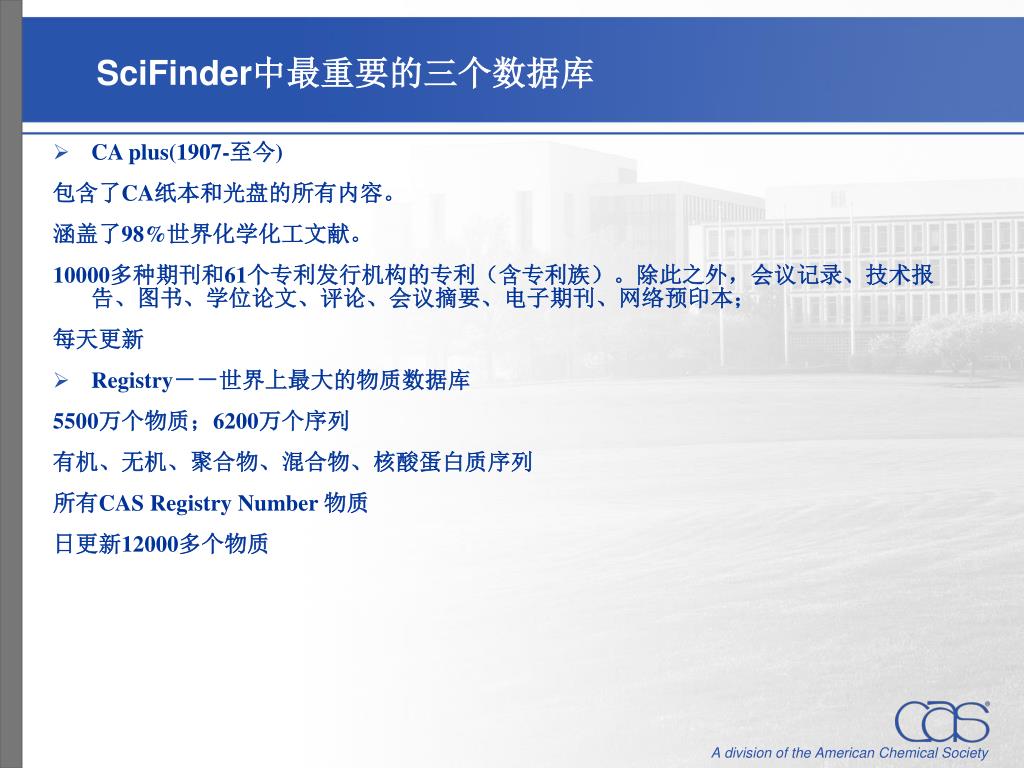 Chemical Abstract Service化学文摘社今天: • 全球最大的学协会组织 • 本部拥有1000多博士从事文献编辑工作 • 为全球超过1500多个学校提供SciFinder桌面检索平台