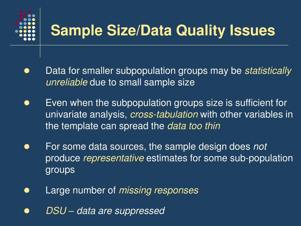 Sample Size/Data Quality Issues • Data for smaller subpopulation groups may be statistically unreliable due to small sample size • Even when the subpopulation groups size is sufficient for univariate analysis, cross-tabulation with other variables in the template can spread the data too thin • For some data sources, the sample design does not produce representative estimates for some sub-population groups • Large number of missing responses • DSU – data are suppressed