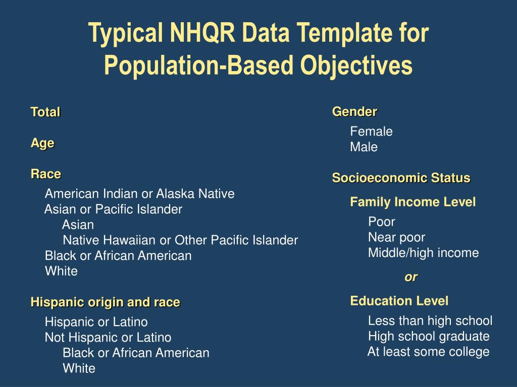 Typical NHQR Data Template for Population-Based Objectives Gender Female Male Socioeconomic Status Family Income Level Poor Near poor Middle/high income or Education Level Less than high school High school graduate At least some college Total Age Race American Indian or Alaska Native Asian or Pacific Islander Asian Native Hawaiian or Other Pacific Islander Black or African American White Hispanic origin and race Hispanic or Latino Not Hispanic or Latino Black or African American White