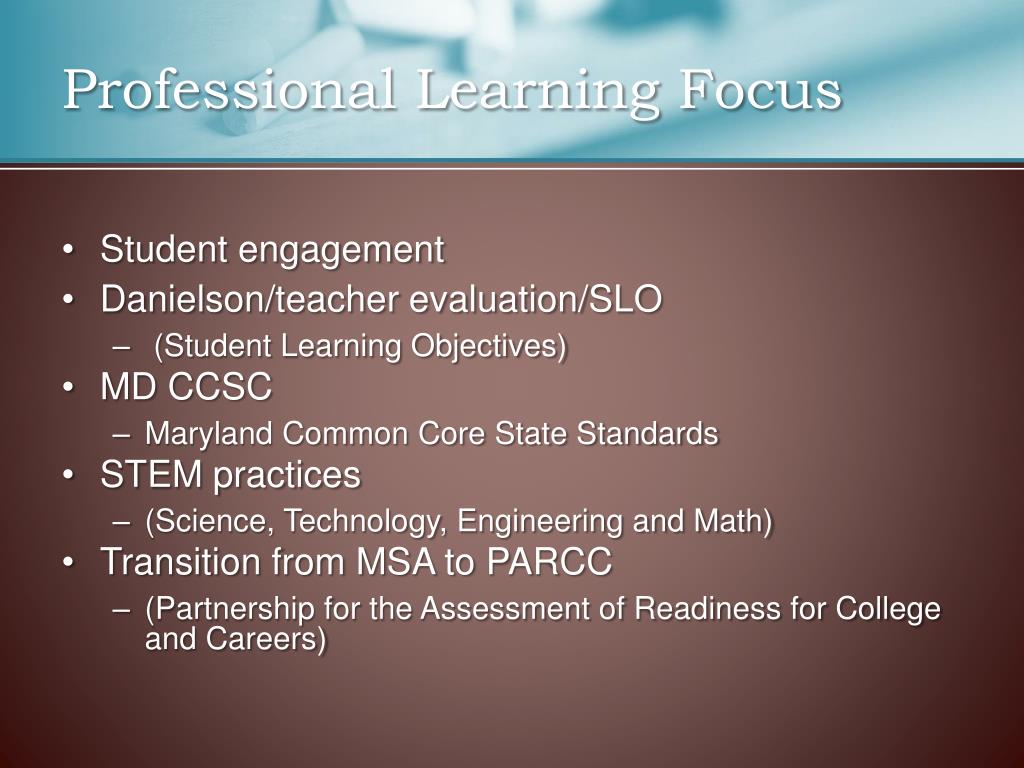 Professional Learning Focus • Student engagement • Danielson/teacher evaluation/SLO • (Student Learning Objectives) • MD CCSC • Maryland Common Core State Standards • STEM practices • (Science, Technology, Engineering and Math) • Transition from MSA to PARCC • (Partnership for the Assessment of Readiness for College and Careers)