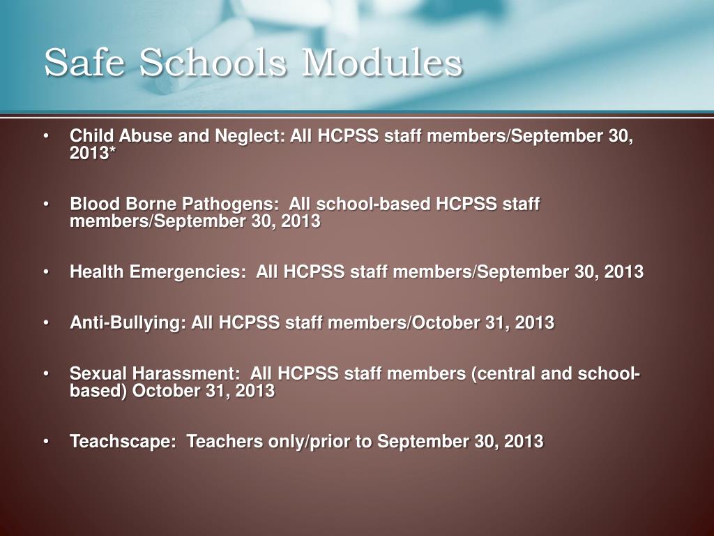 Safe Schools Modules • Child Abuse and Neglect: All HCPSS staff members/September 30, 2013* • Blood Borne Pathogens: All school-based HCPSS staff members/September 30, 2013 • Health Emergencies: All HCPSS staff members/September 30, 2013 • Anti-Bullying: All HCPSS staff members/October 31, 2013 • Sexual Harassment: All HCPSS staff members (central and school-based) October 31, 2013 • Teachscape: Teachers only/prior to September 30, 2013