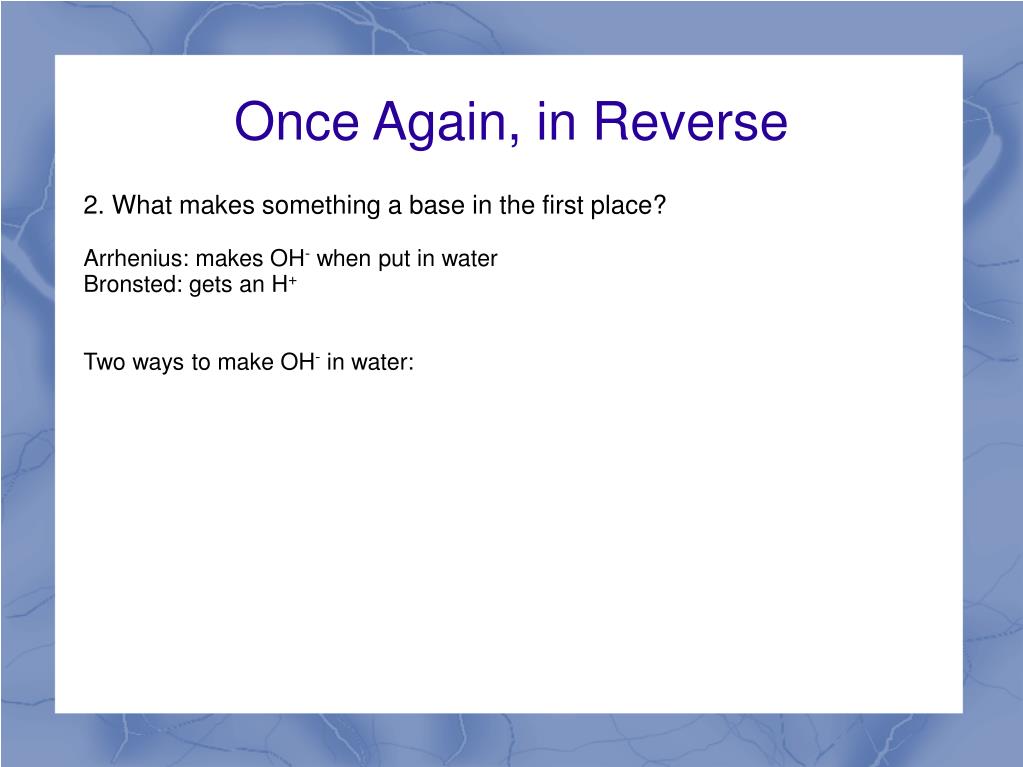 Once Again, in Reverse 2. What makes something a base in the first place? Arrhenius: makes OH- when put in water Bronsted: gets an H+ Two ways to make OH- in water:
