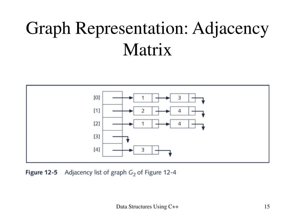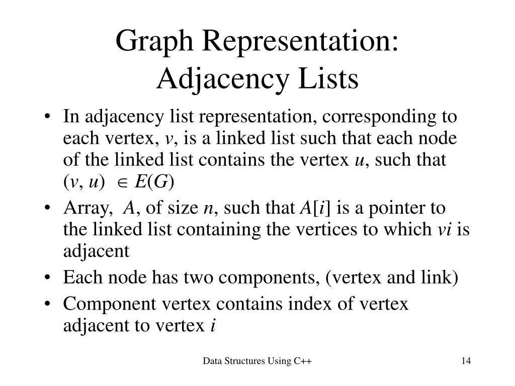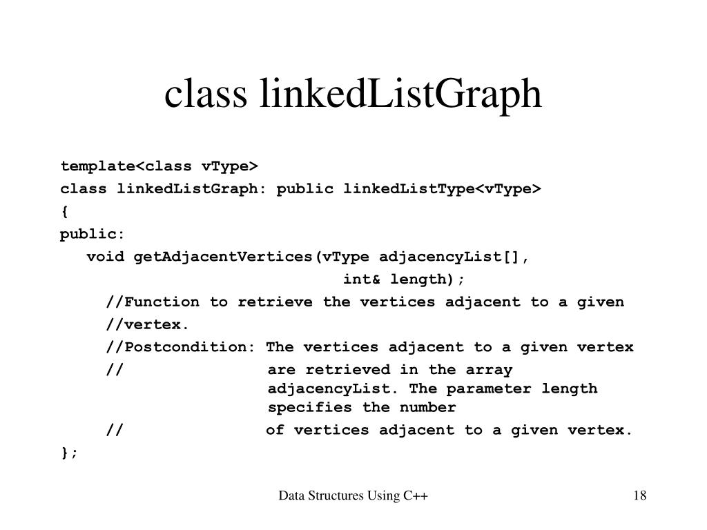 class linkedListGraph template<class vType> void linkedListGraph<vType>::getAdjacentVertices (vType adjacencyList[], int& length) { nodeType<vType> *current; length = 0; current = first; while(current != NULL) { adjacencyList[length++] = current->info; current = current->link; } } Data Structures Using C++