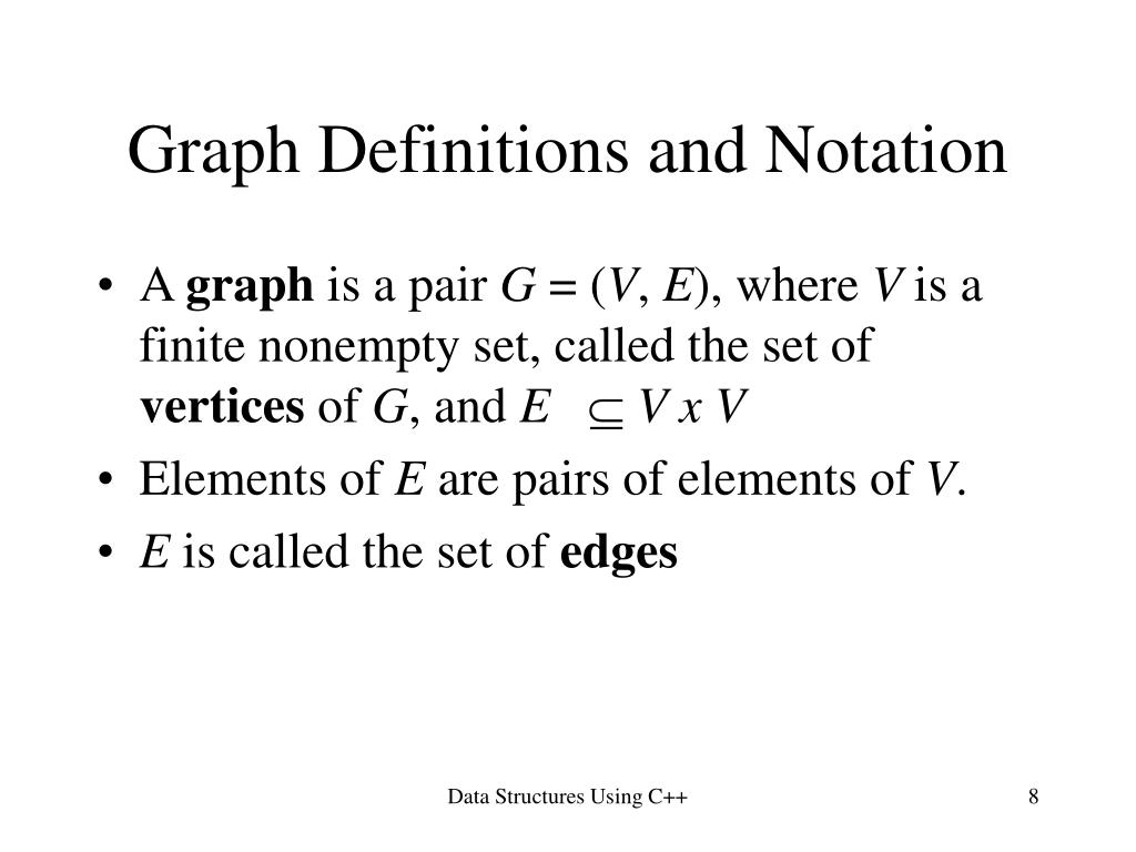 Graph Definitions and Notation • A graph is a pair G = (V, E), where V is a finite nonempty set, called the set of vertices of G, and E V x V • Elements of E are pairs of elements of V. • E is called the set of edges Data Structures Using C++