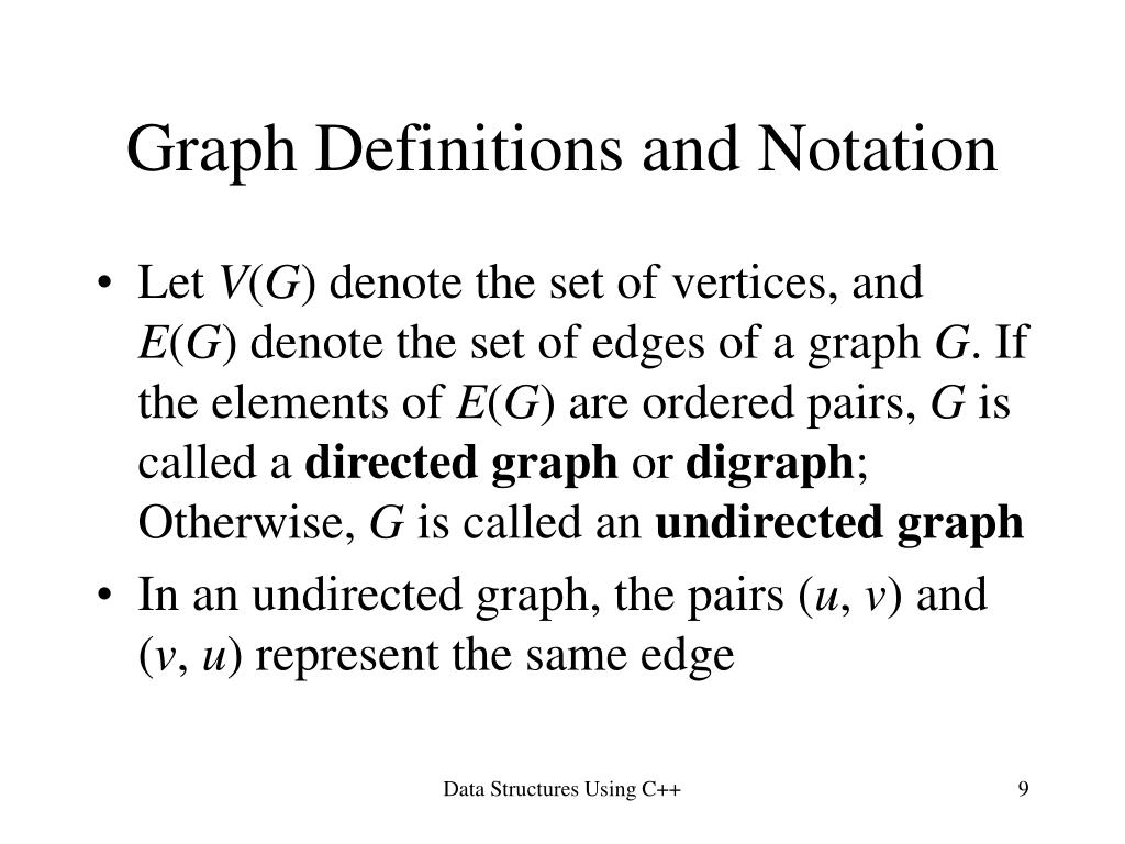 Graph Definitions and Notation • Let V(G) denote the set of vertices, and E(G) denote the set of edges of a graph G. If the elements of E(G) are ordered pairs, G is called a directed graph or digraph; Otherwise, G is called an undirected graph • In an undirected graph, the pairs (u, v) and (v, u) represent the same edge Data Structures Using C++