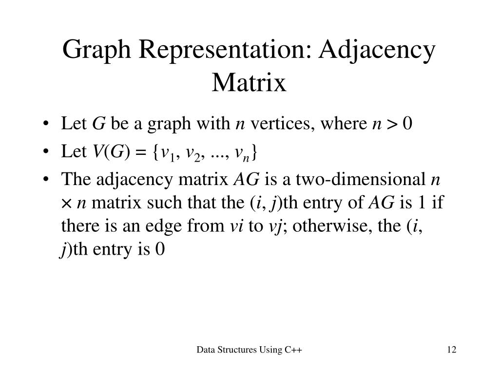 Graph Representation: Adjacency Matrix • Let G be a graph with n vertices, where n > 0 • Let V(G) = {v1, v2, ..., vn} • The adjacency matrix AG is a two-dimensional n × n matrix such that the (i, j)th entry of AG is 1 if there is an edge from vi to vj; otherwise, the (i, j)th entry is 0 Data Structures Using C++