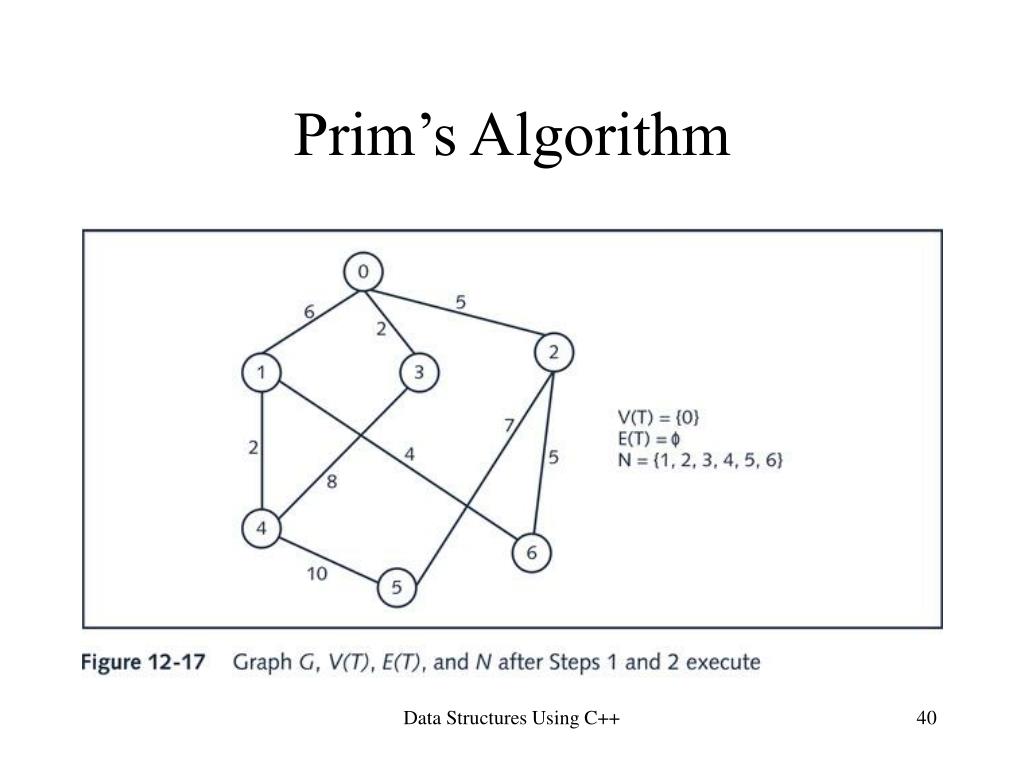 Prim’s Algorithm General form of Prim’s algorithm (let n = number of vertices in G): 1. Set V(T) = {source} 2. Set E(T) = empty 3. for i = 1 to n 3.1 minWeight = infinity; 3.2 for j = 1 to n if vj is in V(T) for k = 1 to n if vk is not in T and weight[vj][vk] < minWeight { endVertex = vk; edge = (vj, vk); minWeight = weight[vj][vk]; } 3.3 V(T) = V(T) {endVertex}; 3.4 E(T) = E(T) {edge}; Data Structures Using C++