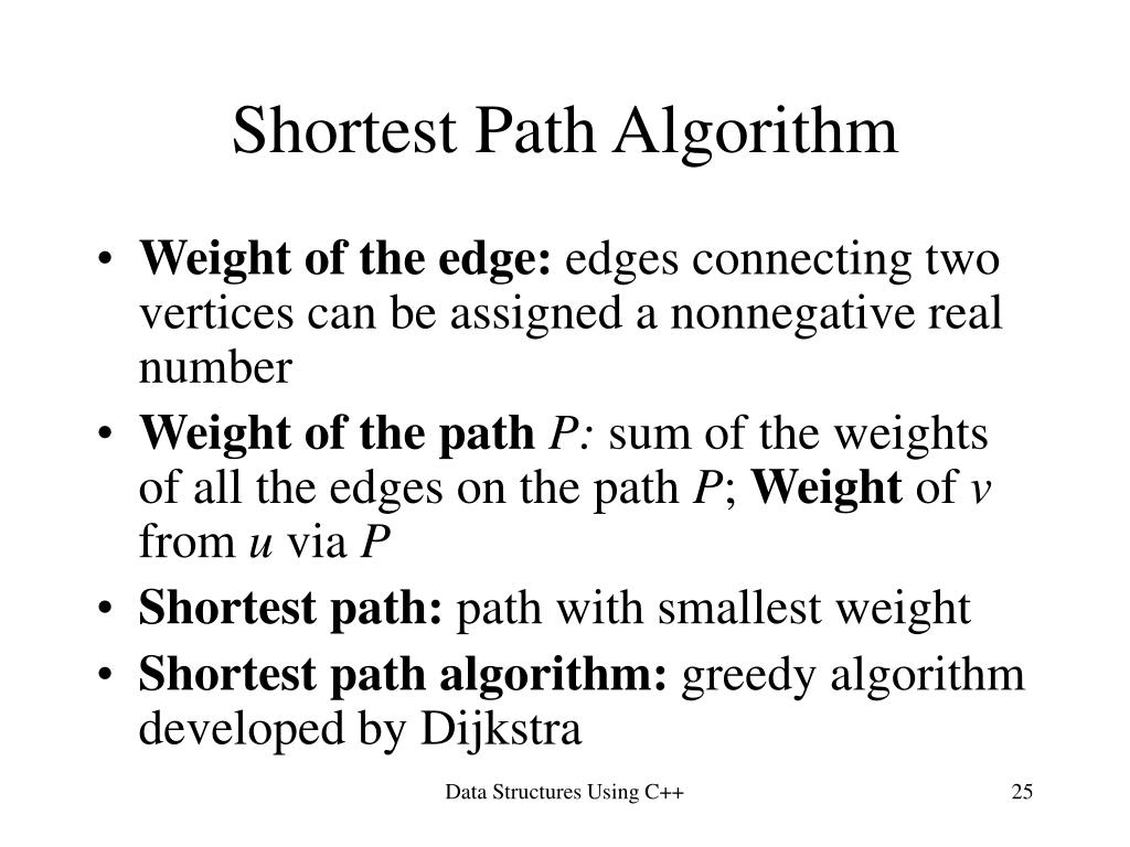 Shortest Path Algorithm • Weight of the edge: edges connecting two vertices can be assigned a nonnegative real number • Weight of the path P: sum of the weights of all the edges on the path P; Weight of v from u via P • Shortest path: path with smallest weight • Shortest path algorithm: greedy algorithm developed by Dijkstra Data Structures Using C++