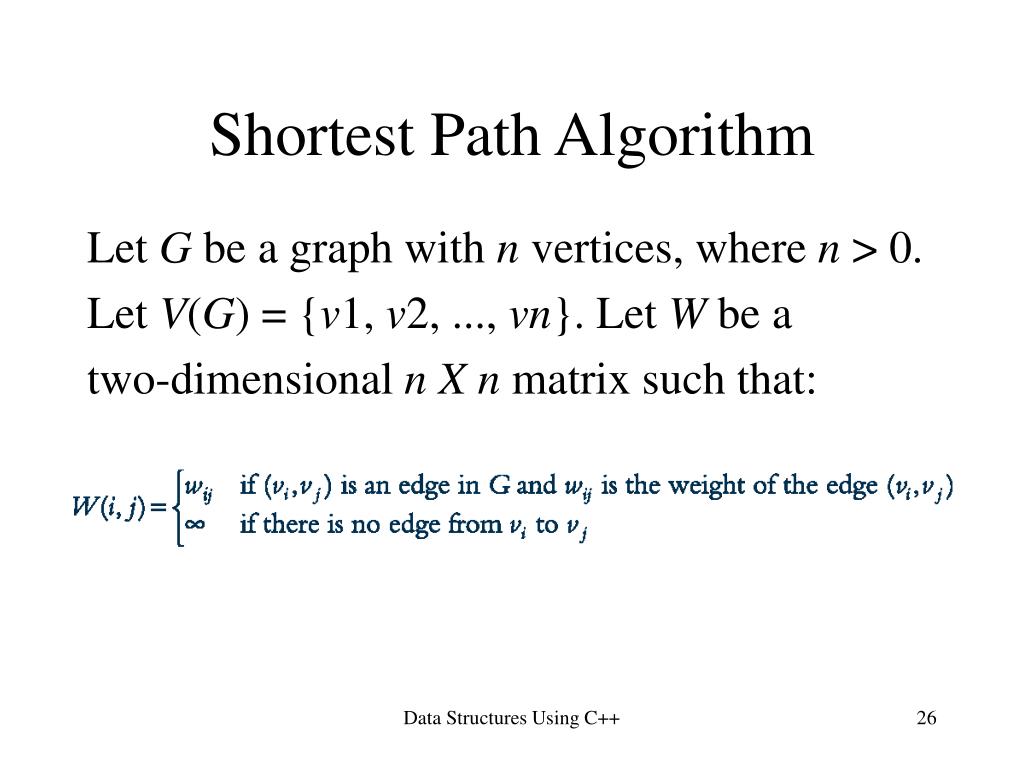 Shortest Path Algorithm Let G be a graph with n vertices, where n > 0. Let V(G) = {v1, v2, ..., vn}. Let W be a two-dimensional n Xn matrix such that: Data Structures Using C++
