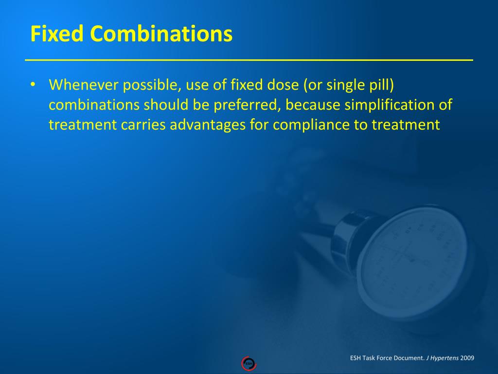Fixed Combinations • Whenever possible, use of fixed dose (or single pill) combinations should be preferred, because simplification of treatment carries advantages for compliance to treatment