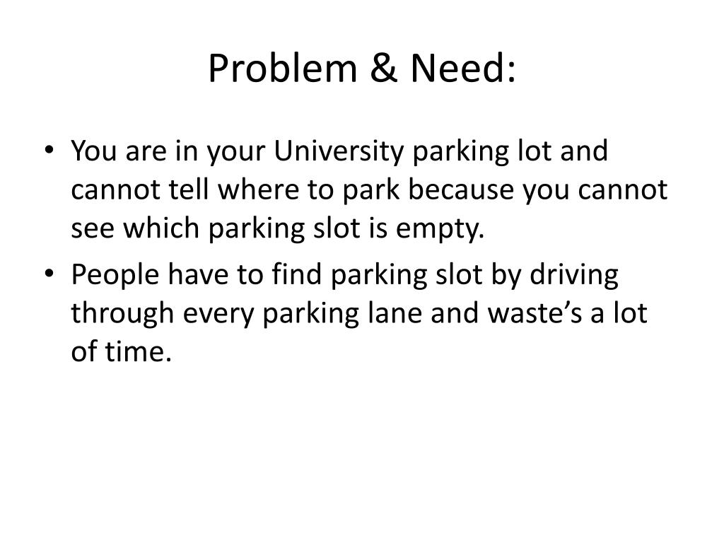 Problem & Need: • You are in your University parking lot and cannot tell where to park because you cannot see which parking slot is empty. • People have to find parking slot by driving through every parking lane and waste’s a lot of time.