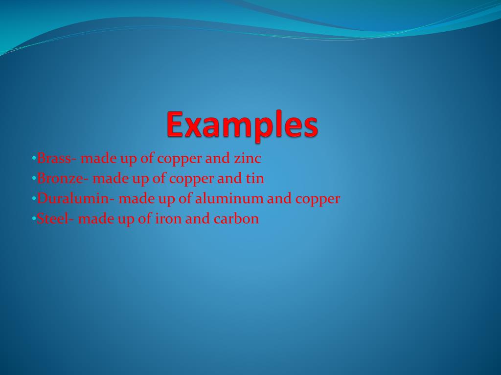 Examples Brass- made up of copper and zinc Bronze- made up of copper and tin Duralumin- made up of aluminum and copper Steel- made up of iron and carbon