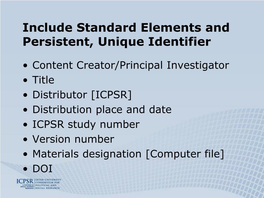 Content Creator/Principal Investigator Title Distributor [ICPSR] Distribution place and date ICPSR study number Version number Materials designation [Computer file] DOI Include Standard Elements and Persistent, Unique Identifier