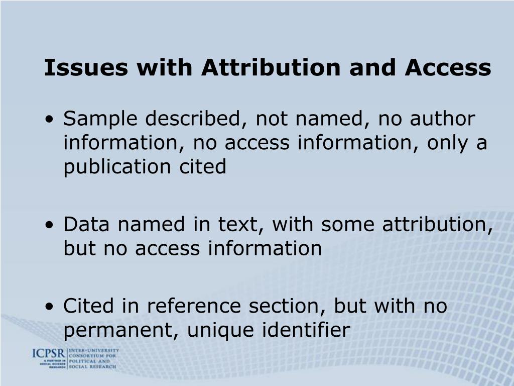 Issues with Attribution and Access • Sample described, not named, no author information, no access information, only a publication cited • Data named in text, with some attribution, but no access information • Cited in reference section, but with no permanent, unique identifier