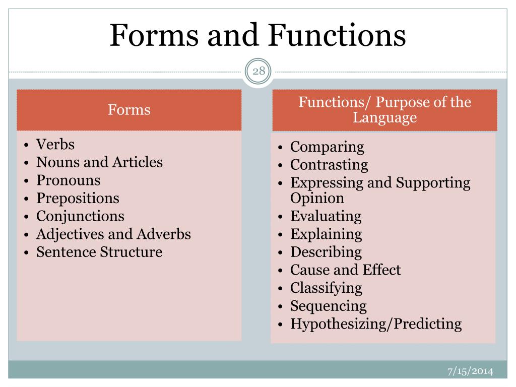 Language Objective Examples • Work with a partner • Highlight: • the form in yellow • the function in green • the vocabulary in pink • the sentence frame in blue • Determine which of the objectives meet the criteria for being a strong language objective.