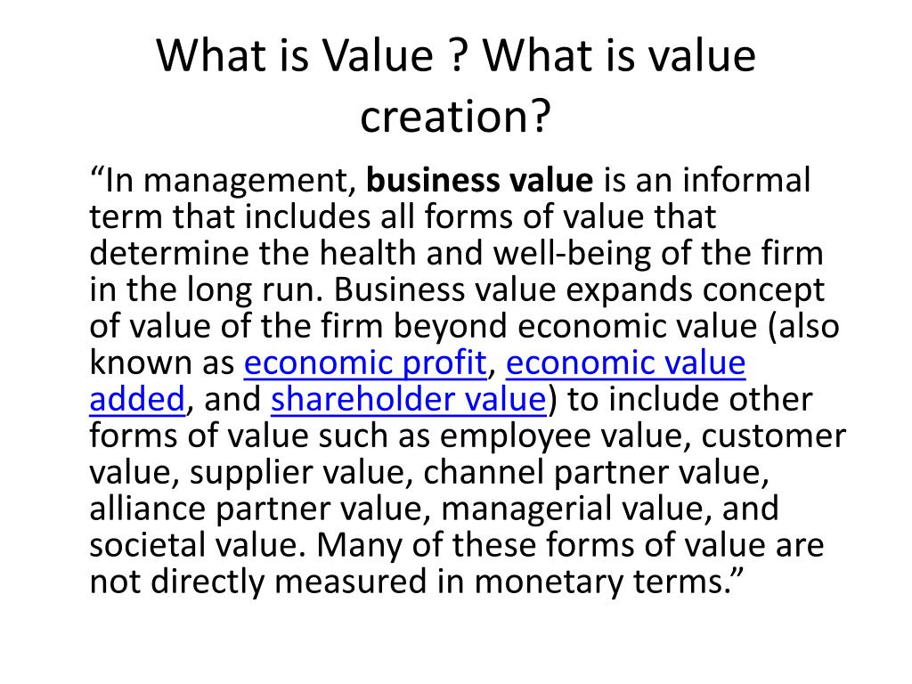 What is Value ? What is value creation? “In management, business value is an informal term that includes all forms of value that determine the health and well-being of the firm in the long run. Business value expands concept of value of the firm beyond economic value (also known as economic profit, economic value added, and shareholder value) to include other forms of value such as employee value, customer value, supplier value, channel partner value, alliance partner value, managerial value, and societal value. Many of these forms of value are not directly measured in monetary terms.”