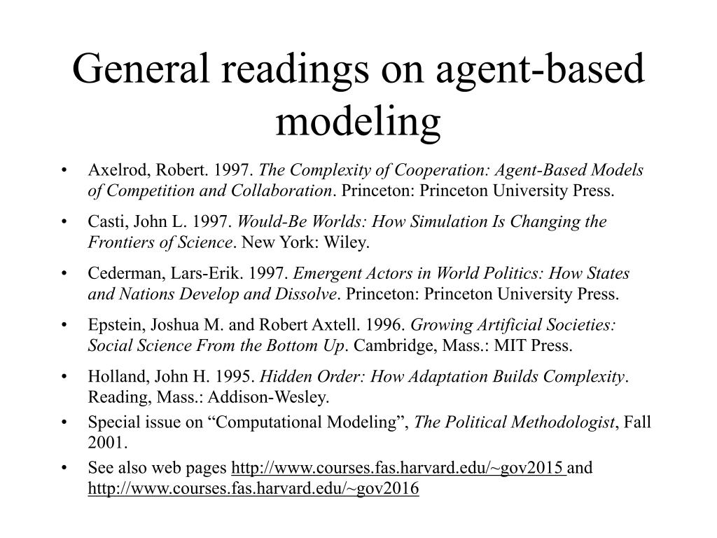 General readings on agent-based modeling • Axelrod, Robert. 1997. The Complexity of Cooperation: Agent-Based Models of Competition and Collaboration. Princeton: Princeton University Press. • Casti, John L. 1997. Would-Be Worlds: How Simulation Is Changing the Frontiers of Science. New York: Wiley. • Cederman, Lars-Erik. 1997. Emergent Actors in World Politics: How States and Nations Develop and Dissolve. Princeton: Princeton University Press. • Epstein, Joshua M. and Robert Axtell. 1996. Growing Artificial Societies: Social Science From the Bottom Up. Cambridge, Mass.: MIT Press. • Holland, John H. 1995. Hidden Order: How Adaptation Builds Complexity. Reading, Mass.: Addison-Wesley. • Special issue on “Computational Modeling”, The Political Methodologist, Fall 2001. • See also web pages http://www.courses.fas.harvard.edu/~gov2015 and http://www.courses.fas.harvard.edu/~gov2016