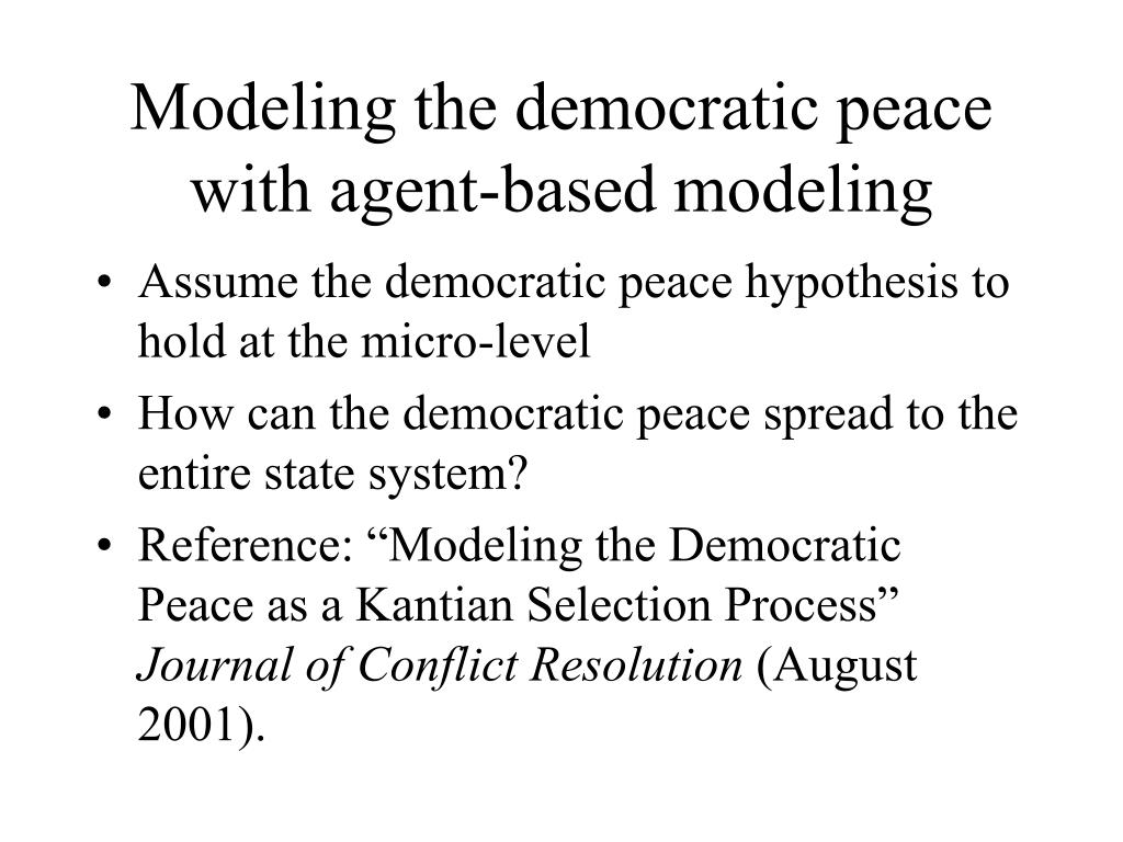 Modeling the democratic peace with agent-based modeling • Assume the democratic peace hypothesisto hold at the micro-level • How can the democratic peace spreadto the entire state system? • Reference: “Modeling the Democratic Peace as a Kantian Selection Process” Journal of Conflict Resolution (August 2001).