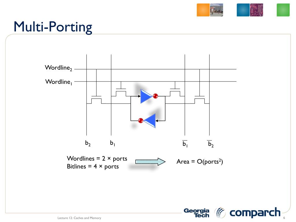Wordline2 b2 b2 Wordlines = 2 × ports Bitlines = 4 × ports Area = O(ports2) Multi-Porting Wordline1 b1 b1 Lecture 12: Caches and Memory