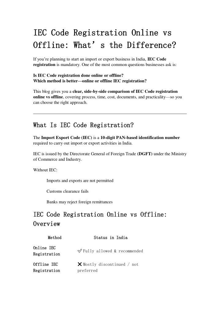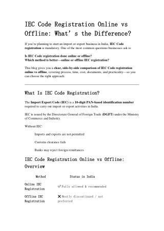 IEC Code Registration Online vs IEC Code Registration Online vs Offline: What Offline: What’ ’s the Difference? s the Difference? If you’re planning to start an import or export business in India, IEC Code registration is mandatory. One of the most common questions businesses ask is: Is IEC Code registration done online or offline? Which method is better—online or offline IEC registration? This blog gives you a clear, side-by-side comparison of IEC Code registration online vs offline, covering process, time, cost, documents, and practicality—so you can choose the right approach. What Is IEC Code Registration? What Is IEC Code Registration? The Import Export Code (IEC) is a 10-digit PAN-based identification number required to carry out import or export activities in India. IEC is issued by the Directorate General of Foreign Trade (DGFT) under the Ministry of Commerce and Industry. Without IEC: Imports and exports are not permitted Customs clearance fails Banks may reject foreign remittances IEC Code Registration Online vs Offline: IEC Code Registration Online vs Offline: Overview Overview Method Method Status in India Status in India Online IEC Online IEC Registration Registration ✅ Fully allowed & recommended ❌ Mostly discontinued / not preferred Offline IEC Offline IEC Registration Registration