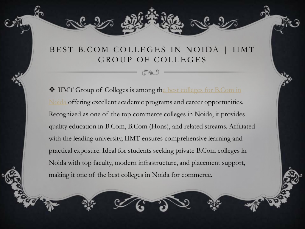 2. BEST B.COM COLLEGES IN NOIDA | IIMT GROUP OF COLLEGES  IIMT Group of Colleges is among the best colleges for B.Com in Noida offering excellent academic programs and career opportunities. Recognized as one of the top commerce colleges in Noida, it provides quality education in B.Com, B.Com (Hons), and related streams. Affiliated with the leading university, IIMT ensures comprehensive learning and practical exposure. Ideal for students seeking private B.Com colleges in Noida with top faculty, modern infrastructure, and placement support, making it one of the best colleges in Noida for commerce.