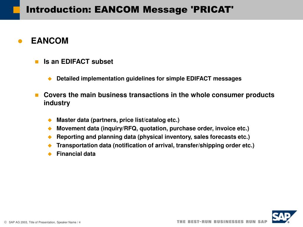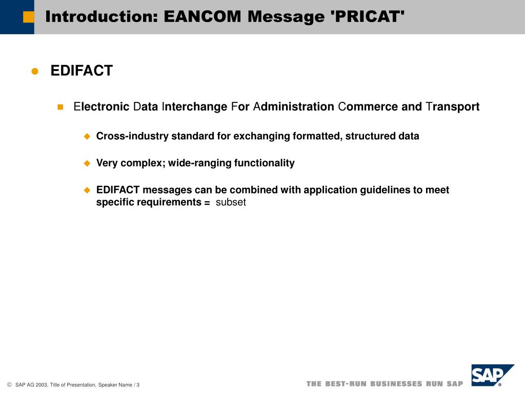Introduction: EANCOM Message 'PRICAT' • EANCOM • Is an EDIFACT subset • Detailed implementation guidelines for simple EDIFACT messages • Covers the main business transactions in the whole consumer products industry • Master data (partners, price list/catalog etc.) • Movement data (inquiry/RFQ, quotation, purchase order, invoice etc.) • Reporting and planning data (physical inventory, sales forecasts etc.) • Transportation data (notification of arrival, transfer/shipping order etc.) • Financial data